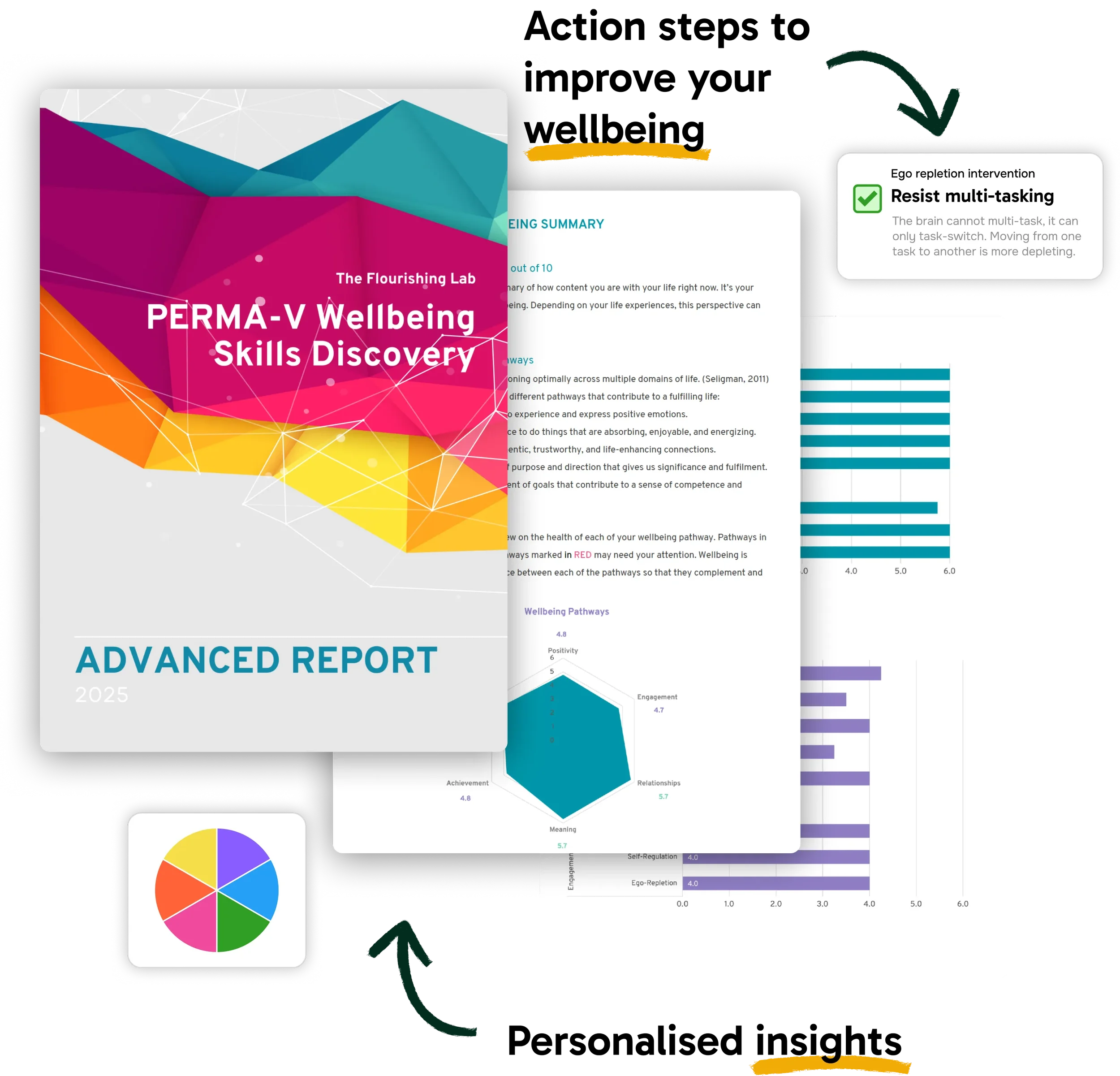 With our PERMA-V Wellbeing Skills Discovery Tool, you’ll get a clear, personalised picture of your current strengths and the areas where you have room to grow. It’s a chance to understand your wellbeing in a deeper, more actionable way, so you can focus on the right skills, take meaningful steps forward, and ultimately experience greater flourishing in every part of your life.